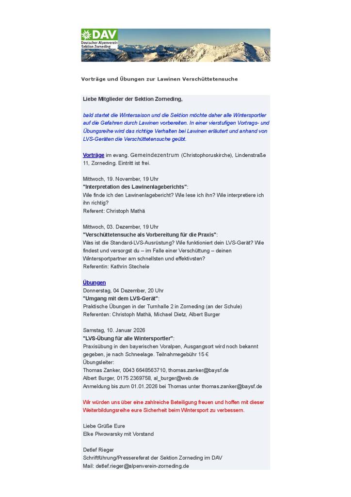 bald startet die Wintersaison und die Sektion möchte daher alle Wintersportler auf die Gefahren durch Lawinen vorbereiten. In einer vierstufigen Vortrags- und Übungsreihe wird das richtige Verhalten bei Lawinen erläutert und anhand von LVS-Geräten die Verschüttetensuche geübt