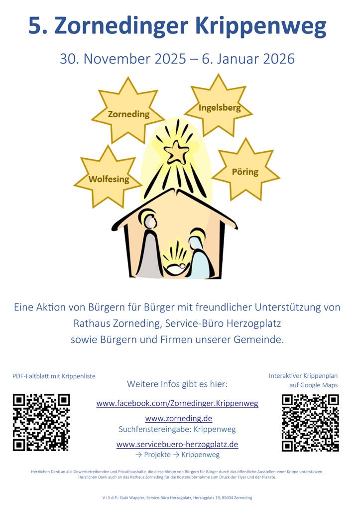 Die Krippen können vom 30.11.2025 bis 06.01.2026 angeschaut werden und sind abends bis 22.00 Uhr beleuchtet. Die Standorte der Krippen werden in einem Flyer, der Anfang Dezember im Rathaus erhältlich ist und auch in einem Plan der auf der Homepage des Service-Büros Am Herzogplatz www.servicebuero-herzogplatz.de und der Gemeinde www.zorneding.de jeweils unter dem Stichwort „Krippenweg“ zu finden sein.