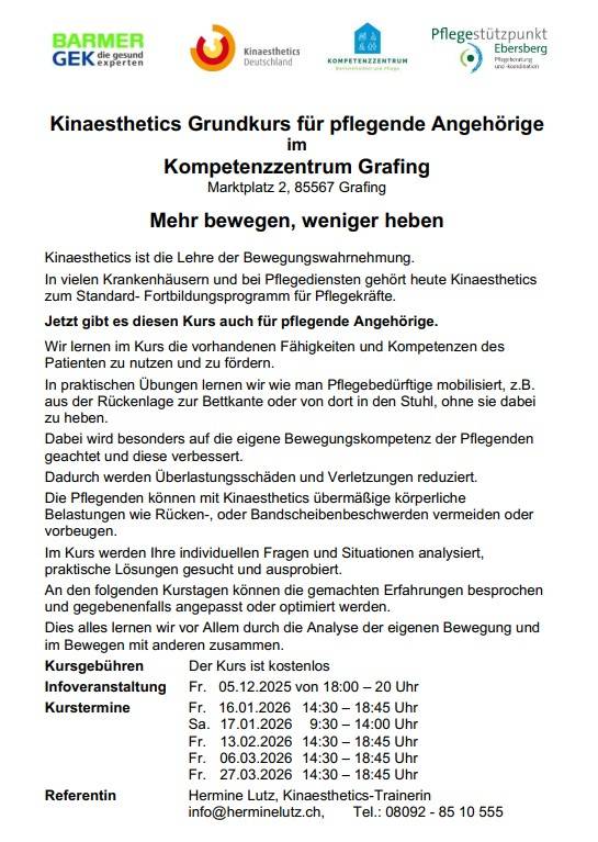 Der Pflegestützpunkt Ebersberg und das Kompetenzzentrum Grafing informieren über einen Kinaesthetics Grundkurs für pflegende Angehörige. Die Teilnahme ist kostenlos.