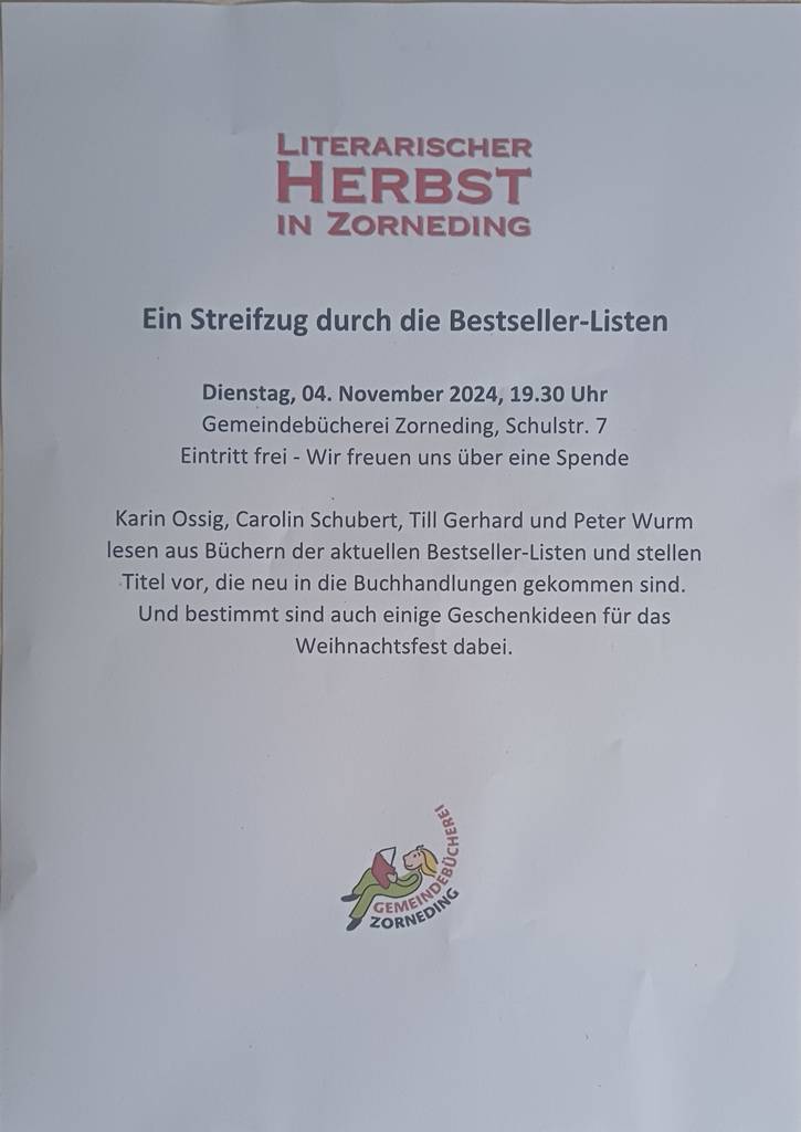 Am Dienstag, den 4. 11 2025 um 19:30 Uhr finden im Rahmen des "Literarischen Herbstes" in der Gemeindebücherei Zorneding wieder der beliebte "Streifzug durch die Bestsellerlisten" statt.