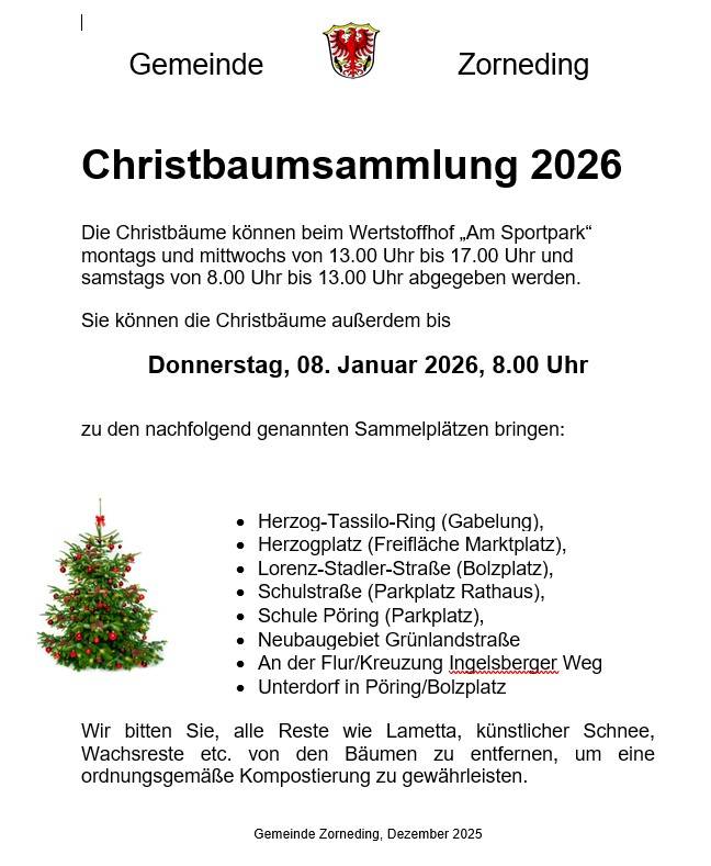 haben Sie einen Christbaum, den Sie entsorgen möchten? Sie können diesen natürlich selbst zu den Öffnungszeiten zum Zornedinger Wertstoffhof bringen. Alternativ können Sie ihn an einen der Sammelplätze in Ihrem Wohngebiet bis zum 08.01.2026 um 8.00 Uhr zur Abholung ablegen (siehe beigefügte Übersicht).