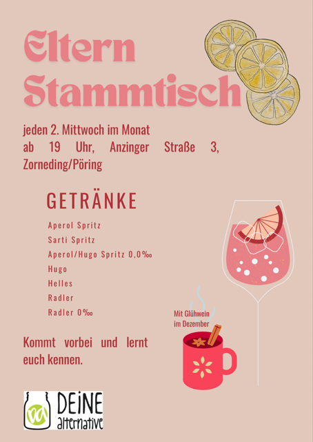 Jeden 2. Mittwoch im Monat findet im Unverpackt-Laden "Deine Alternative", in Pöring, Anzinger Str. 3 ein Elternstammtisch statt. Alle sind herzlich eingeladen!