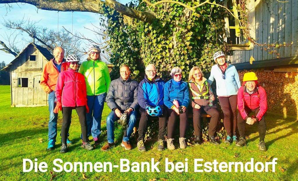 Frei nach Rilke könnte man sagen "Wer jetzt noch nicht geradelt ist, der fährt nicht mehr". Aber wir haben zu neunt zwei Plätze in der Sonne angesteuert. Bei 13° sind wir los durch den Wald nach Buch. Nach 10km waren wir an der Bank bei Esterndorf. Ein richtiger Sonnenplatz. Kurze Pause und Foto-Termin, dann ging's mit viel Tempo die Steinsee-Straße runter bis zur Abzweigung nach Maria Altenburg und Moosach-Bahnhof. Dort hat die Moosach ein breiteres Flussbett bekommen, es wurden Wege angelegt, sehr schön. Beim Rückweg mussten wir alles wieder hochstrampeln, was wir vorher im Schuß runter sind. Zuerst den Falkenberg rauf, für Radler eine Herausforderung, aber mit Pedelec ... dann den anspruchsvollen Mühlweg zur 2. Sonnen-Bank. Die Sonne war schon weg, aber wir haben das Panorama genossen. Dann über Kirchseeon, durchs ehemalige Schwellenwerk und die letzte Steigung nach Riedering rauf. Über Eglharting waren wir nach 27km wieder am Herzogplatz. Jetzt ab nach Hause zum heißen Tee.