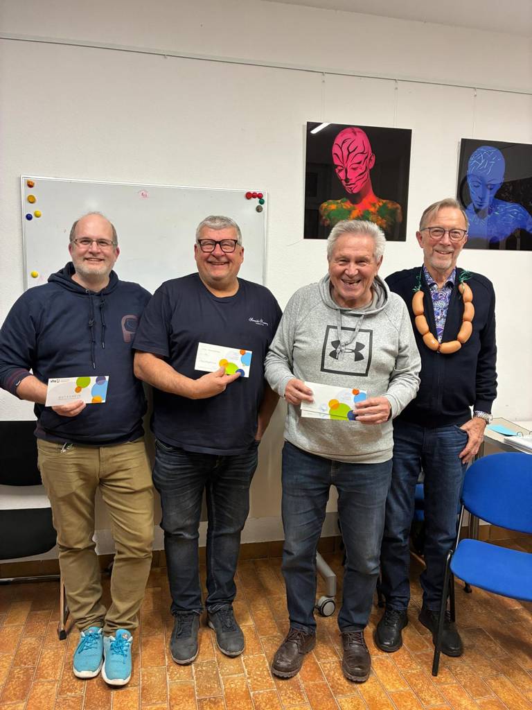 Gestärkt druch warmen Leberkäse mit Kartoffelsalat wurde an 3 Tischen erbittert um den Sieg gekämpft. Nach 32 Spielen setzte sich Gerhard Wolf mit 37 Punkten als Sieger durch. Den zweiten Platz belegte mit 28 Punkten Jens Forsbach und dritter wurde mit 12 Punkten Richard Bredenfeld. Auch Ingo Tögel freute sich als Letzter mit minus 19 Punkten über einen Wurstkranz.