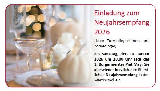 am Samstag, den 10. Januar 2026 um 20.00 Uhr lädt der Erste Bürgermeister Piet Mayr Sie alle wieder herzlich zum öffentlichen Neujahrsempfang in den Martinstadl ein. Wir freuen uns auf Ihr Kommen.