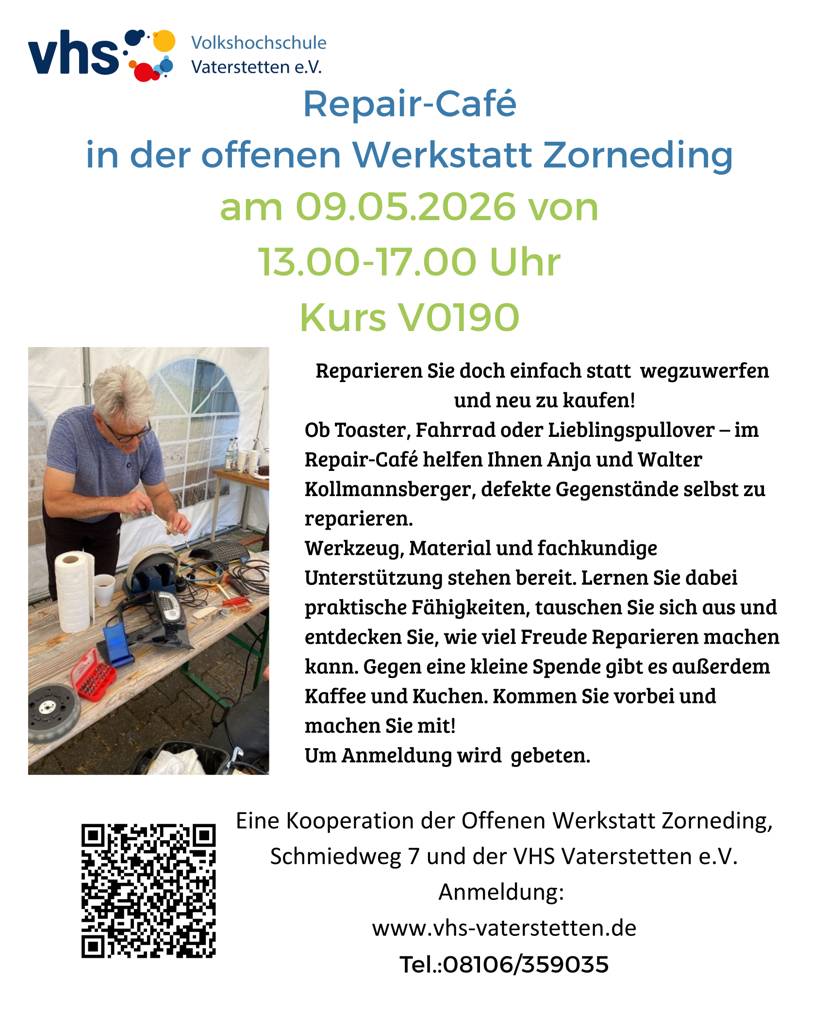 Werkzeug, Material und fachkundige Unterstützung stehen bereit. Lernen Sie dabei praktische Fähigkeiten, tauschen Sie sich aus und entdecken Sie, wie viel Freude Reparieren machen kann. Gegen eine kleine Spende gibt es außerdem Kaffee und Kuchen. Kommen Sie vorbei und machen Sie mit!