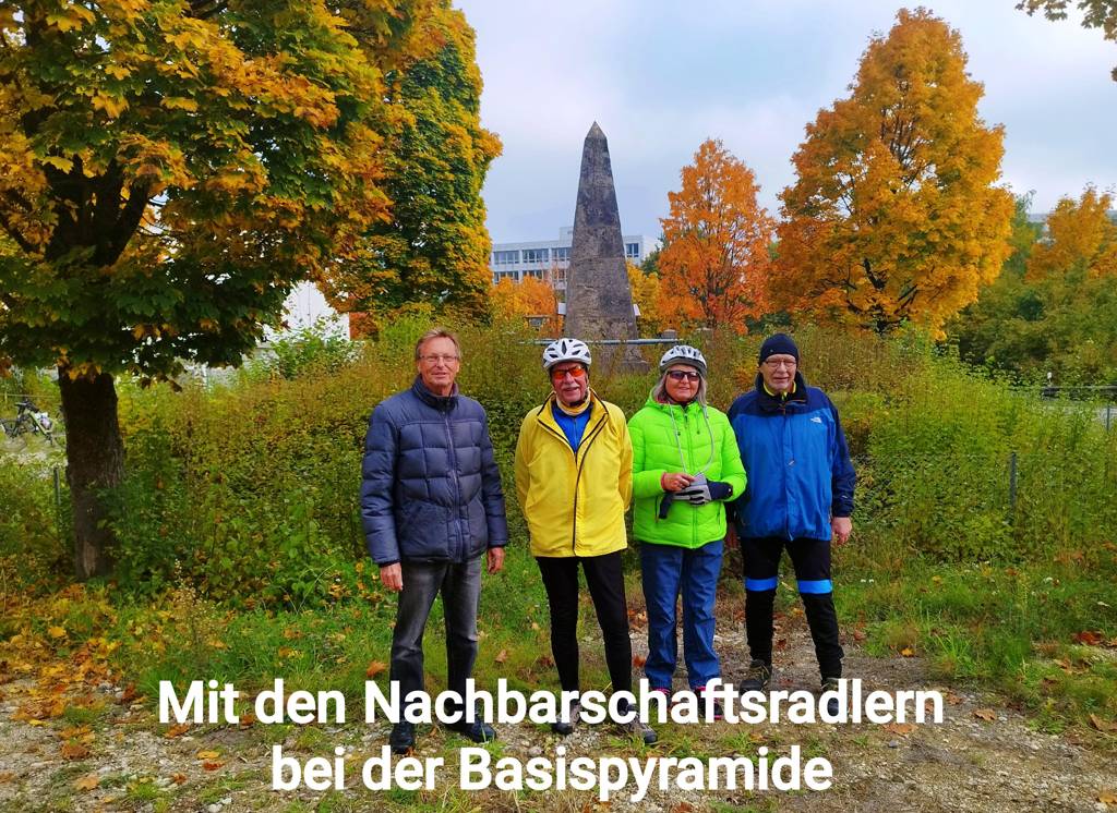 Eigentlich hätte es auch Rote-Nasen-Tour heißen können, denn es war knapp 11° kalt. Wir sind warm eingepackt losgeradelt. Der Weg führte uns über Vaterstetten, durch den BUGA-Park nach Riem. Weiter ging's über Daglfing und Johanniskirchen zum Heizkraftwerk-Nord. Zur Basis-Pyramide gibt es wenige Wegweiser, man muss schon wissen, wo sie steht. Die Geschichte ist auf einer Tafel nachzulesen, detailliertere Beschreibungen gibt's z.B. auf Wikipedia. Kurz: Sie markiert den Anfang der 1802 vermessenen Basisline von Unterföhring nach Aufkirchen und stellt die Grundlage der Landvermessung in Bayern dar. Der Hinweg war recht einfach, aber auf dem Rückweg hatten wir mit Mucken der Navigation zu kämpfen. Wir waren oft auf der Straße, aber auch auf Wiesenwegen und eine Treppe mussten wir auch hochschieben. Vorbei an Dornach und am Fidschi-See, weiter über Parsdorf nach Baldham-Dorf und Zorneding. Insgesamt sind wir 48km geradelt. Nicht schlecht für eine kleine Runde am Nachmittag.
