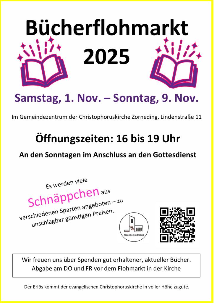 Der beliebte Bücherflohmarkt in der ev. Christophoruskirche in Zorneding findet in den Herbstferien von Samstag 1. November bis Sonntag 9. November statt. Zu den Öffnungszeiten 16:00 bis 19:00 Uhr und an den Sonntagen zusätzlich nach dem Gottesdienst können Sie noch Herzenslust in den Räumen der Christophoruskirche in unserem reichhaltigen Sortiment stöbern und einkaufen.