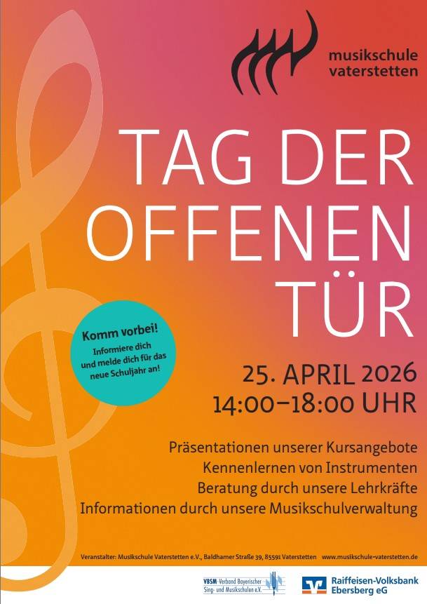 Am 25. April 2026 ist es wieder so weit! Die Musikschule Vaterstetten lädt alle Musikbegeisterten zu ihrem Tag der offenen Tür in die Baldhamerstraße 39 in Vaterstetten ein.