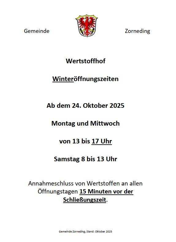 ab dem 24.10.2025 gelten am Wertstoffhof wieder die Winteröffnungszeiten: