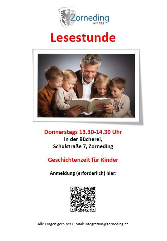 unsere Integrationsbeauftragte Frau Smirnova organisiert eine neue Veranstaltung nämlich eine Lesestunde für Kinder in der Bücherei. Wenn Sie bzw. Ihre Kinder Interesse daran haben, melden Sie sich gerne bei Frau Smirnova per E-Mail an integration@zorneding.de.