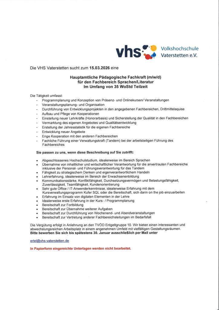 Die VHS Vaterstetten e.V. sucht zum 15.03.2026 eine Hauptamtliche Pädagogische Fachkraft (m/w/d) für den Fachbereich Sprachen/Literatur im Umfang von 35 WoStd. / Teilzeit